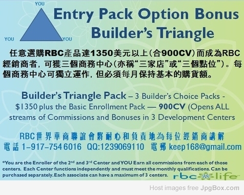 任意選購RBC Life產品達1350美元以上(合900CV)而成為RBC經銷商者,可獲三個商務中心(亦稱“三家店”或“三個點位”)。每個商務中心可獨立運作,但必須每月保持基本的購貨額。Builder’s Triangle Pack – 3 Builder’s Choice Packs - $1350 plus the Basic Enrollment Pack –– 900CV (Opens ALL streams of Commissions and Bonuses in 3 Development Centers