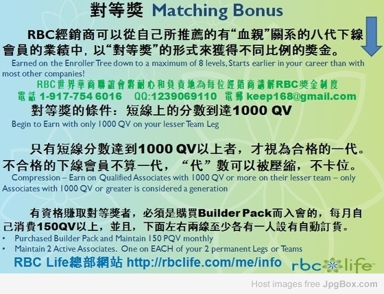 RBC Life經銷商可以從與自己有推薦關系的八代下線會員的業績中,以“對等獎”(Matching Bonus)的形式,分別按5%至30%的比例來賺取對等獎金,而且沒有時間限制。有資格賺取“對等獎”者,必須是購買Builder Pack而入會的,每月自己消費150 QV以上,短線分數達到1000 QV,並且,下面左右兩線至少各有一人設有自動訂貨。只有短線分數達到1000 QV以上者,才視為合格的一代。不合格的下線會員不算一代,代數可以被壓縮,不卡位。