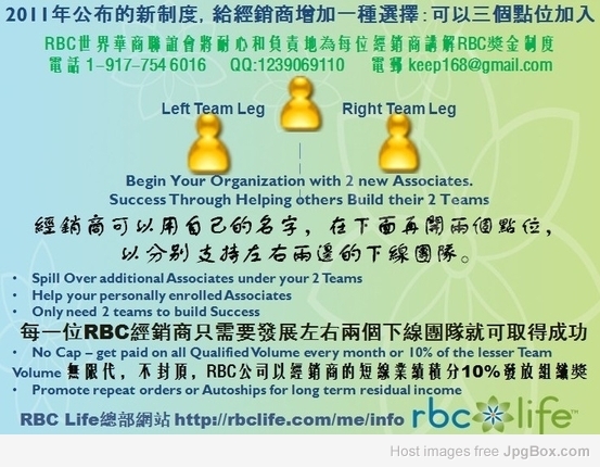 2011年RBC Life在新公布的直銷制度中,給經銷商增加了一種選擇:可以三個點位(Builder’s Triangle)加入,而原先只限一個點位加入。已入會的RBC直銷人員,獲準可用自己的名字,在下面再開兩個點位,以分別支持左右兩邊的下線團隊。不過,在RBC“雙軌制”下,每一位經銷商只需要發展左右兩個下線團隊就可取得成功。Only need 2 teams to build Success