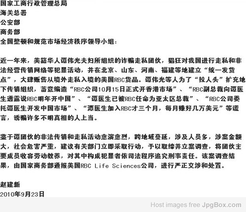 《呼吁打击境外谭伟光诈骗走私团伙在我国非法组织传销活动》国家工商行政管理总局、海关总署、公安部、商务部、全国整顿和规范市场经济秩序领导小组: 近一年来,美籍华人谭伟光夫妇所组织的诈骗走私团伙,猖狂对我国进行走私和非法经营传销网络等犯罪活动,并在北京、山东、河南、福建等地建立“统一发货点”,大肆贩售从境外走私入境的美国RBC货品。谭伟光等人为了“拉人头”扩充地下传销组织,蓄意编造“RBC公司10月15日正式开香港市场”、“RBC副总裁向谭医生透露说RBC明年开中国”、“谭医生已被RBC任命为亚太区总裁”、“RBC公司委托谭医生开发中国市场”、“潭医生加入RBC才三个月,每月赚好几万美元”等谎言,诱骗许多不明真相的人上当。 鉴于谭团伙的非法传销和走私活动愈演愈烈,跨地域蔓延,涉及人员多,涉案金额大,社会危害严重,建议有关部门立即采取行动,予以取缔并立案调查,将团伙主要成员收容劳动教养,对其中构成犯罪者依司法程序追究刑事责任。该案调查结果,由国家商务部通报美国RBC Life Sciences公司,进行严正交涉和处置。 赵建新 2010年9月23日