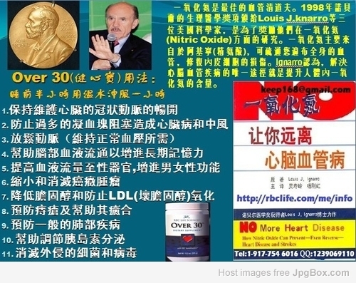 Over 30(健心寶)用法:睡前半小時用溫水沖服一小時。【功效】1.保持維護心臟的冠狀動脈的暢開2.防止過多的凝血塊阻塞造成心臟病和中風3.放鬆動脈(維持正常血壓所需)4.幫助腦部血液流通以增進長期記憶力5.提高血液流量至性器官,增進男女性功能6.縮小和消滅癌癥腫瘤7.降低膽固醇和防止LDL(壞膽固醇)氧化8.預防痔瘡及幫助其癒合9.預防一般的肺部疾病10.幫助調節胰島素分泌11.消滅外侵的細菌和病毒 (一氧化氮是最佳的血管清道夫。1998年諾貝爾的生理醫學獎項頒給Louis J.knarro等三位美國科學家,是為了獎勵他們在一氧化氮(Nitric Oxide)方面的研究。一氧化氮主要來自於阿基寧(精氨酸),可疏通您遍布全身的血管,修復內皮細胞的損傷。Ignarro認為,解決心腦血管疾病的唯一途徑就是提升人體內一氧化氮的含量。)