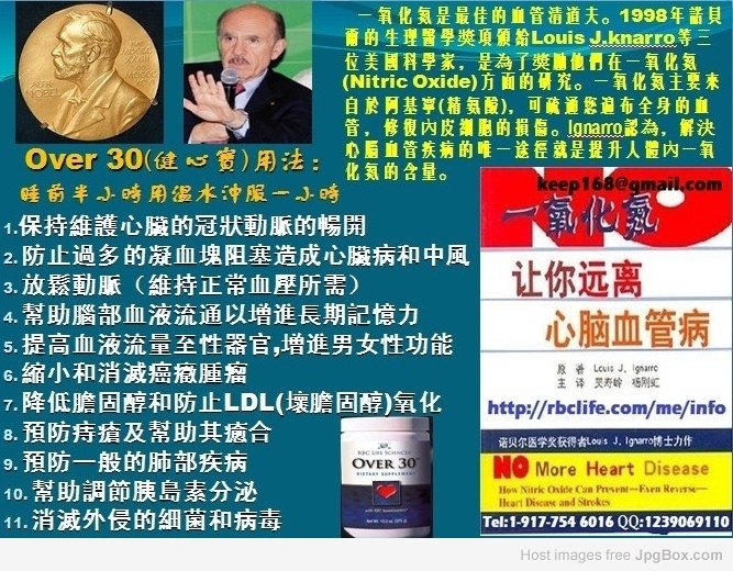 Over 30(健心寶)用法:睡前半小時用溫水沖服一小時。【功效】1.保持維護心臟的冠狀動脈的暢開2.防止過多的凝血塊阻塞造成心臟病和中風3.放鬆動脈(維持正常血壓所需)4.幫助腦部血液流通以增進長期記憶力5.提高血液流量至性器官,增進男女性功能6.縮小和消滅癌癥腫瘤7.降低膽固醇和防止LDL(壞膽固醇)氧化8.預防痔瘡及幫助其癒合9.預防一般的肺部疾病10.幫助調節胰島素分泌11.消滅外侵的細菌和病毒 (一氧化氮是最佳的血管清道夫。1998年諾貝爾的生理醫學獎項頒給Louis J.knarro等三位美國科學家,是為了獎勵他們在一氧化氮(Nitric Oxide)方面的研究。一氧化氮主要來自於阿基寧(精氨酸),可疏通您遍布全身的血管,修復內皮細胞的損傷。Ignarro認為,解決心腦血管疾病的唯一途徑就是提升人體內一氧化氮的含量。)