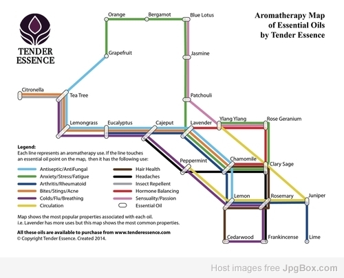 Aromatherapists and home users of essential oils will often require a reference book of aromatherapy blends. However, using multiple books and pages is often a cumbersome way to quickly recollect each oils use. The best way to show a lot of information on an single page is through an infographic map. This map of essential oils, by Tender Essence, combines pages of aromatherapy books into an easy to use blending guide.